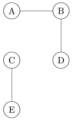 Hay dos subgrafos conectados máximos arriba, uno asociado con los nodos {A, B, D} y el otro con los nodos {C, E}.